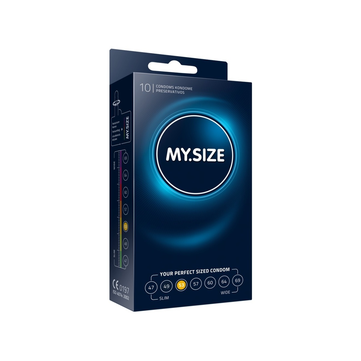 Páni, vaše vzrušenie a intenzívne zážitky sú priamo závislé na vašom pohodlí. Doprajte si dokonale padnúcu veľkosť a vychutnajte si aj so svojou drahou polovičkou novú dimenziu chráneného a bezpečného sexu. Kondómy značky MY.SIZE sú jedinečné práve v tom, že si vyberiete šírku takú, aby vám bol tak akurát. Nevhodný kondóm neprinesie požadované potešenie, kĺže alebo je naopak veľmi tesný, čo zvýši nepohodlie. Tento kondóm má menovitú šírku 53 mm a dĺžku 17,8 cm a je ideálny pre priemer penisu približne 3,5 cm až 3,7 cm. Disponuje rezervoárom a ľahko sa nasadzuje. Kondómy MY.SIZE sa vyrábajú z prírodného kaučuku prvotriednej kvality a každý z nich je elektronicky testovaný. Použitá špeciálna latexová zmes ponúkne mimoriadnu pevnosť a neuveriteľnú odolnosť aj cez to, že je kondóm vysoko elastický. Perfektnú citlivosť a luxusné intímne zážitky zaistí extrémne tenká stena kondómu, ktorá má len 0,05 mm. Každý kondóm MY.SIZE je lubrikovaný čistým silikónovým olejom, ktorý zlepšuje kĺzavosť a poskytuje prirodzenejší pocit. Lubrikant neobsahuje chemické spermicídne látky, teda je považovaný za netoxický a nedráždivý. Nepoznáte svoju veľkosť? Využite mobilnú aplikáciu na stránke www.mysize-measure.com, kde jednoducho zistíte, aký vybrať práve pre vás.