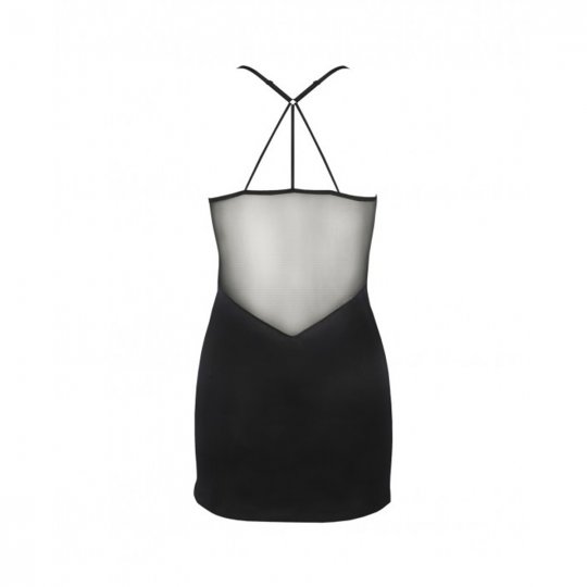 Táto výnimočná koiežka v sexi čiernej farbe je uitá zo zamatovo hodvábnej saténovej tkaniny žahko lesklého charakteru, ktorá je nepriehžadná a zahalí tak potrebné partie. V kombinácii s priesvitným jemným tylom vak podporí tajomnú intímnu atmosféru. Tento pruný materiál sa skvele prispôsobí vaim krivkám a dobre sa nosí. Ramienka sa spájajú na chrbte, čo vytvára pôsobivý geometrický prvok. Pýi sa zdobeným dekoltom prostredníctvom tenkých prekríených prúkov v hlbokom výstrihu, ktorý nenechá chladným iadneho mua a na tele vyzerá jednoducho skvele. Zodpovedajúce minimalistické tangá s tenkými núrkami a saténovým predným panelom potom vyzdvihnú krásu váho zadočku.
