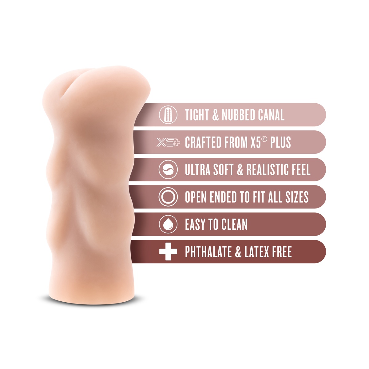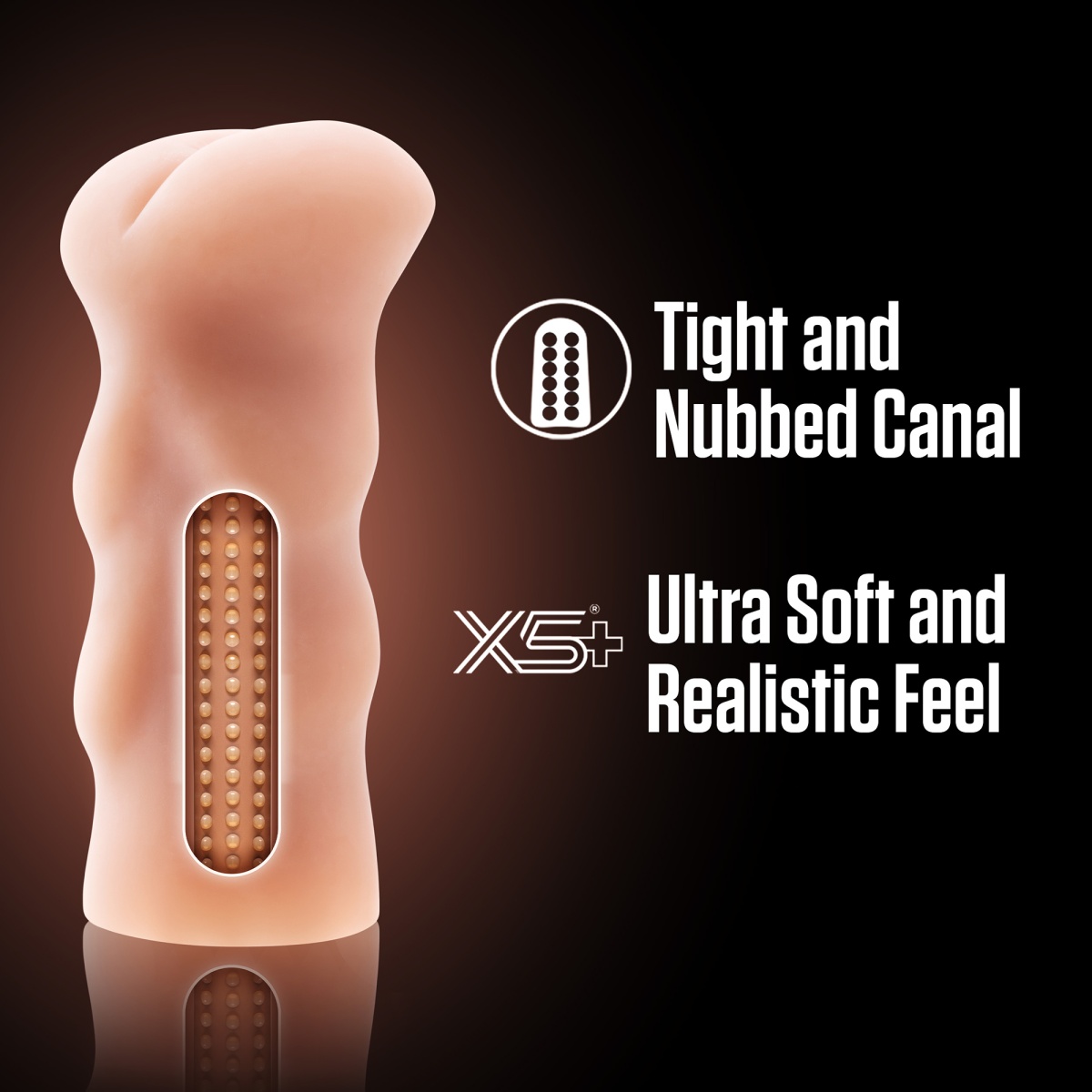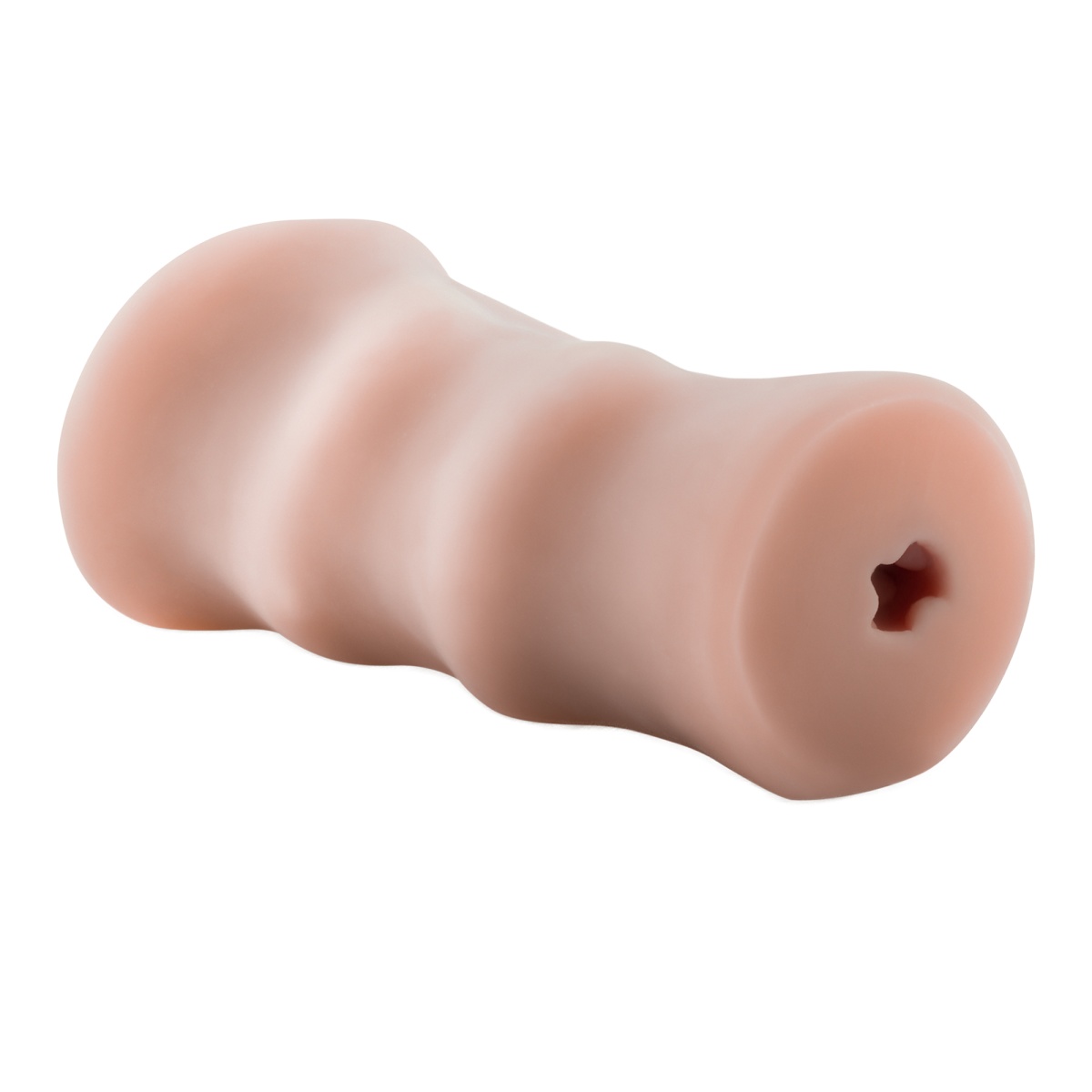 Telo masturbátora v svetlejšej telovej farbe je vyrobené z prémiového realistického materiálu X5® Plus, ktorý na dotyk aj pri používaní dokonale napodobňuje ľudskú pokožku. Je mimoriadne pružný, poddajný a zároveň pevný, aby zaistil autentický pocit tesnosti pri každom pohybe. Vnútorný úzky stimulačný tunel je zdobený sofistikovanou textúrou s výraznými hrotmi, ktoré špičkovo masírujú penis. Roztiahnuteľný otvor s pôvabnými detailmi pôsobí prirodzene a zvodne. Telo potom zaisťuje pohodlné držanie a jednoduchú manipuláciu aj pri dlhšom používaní.