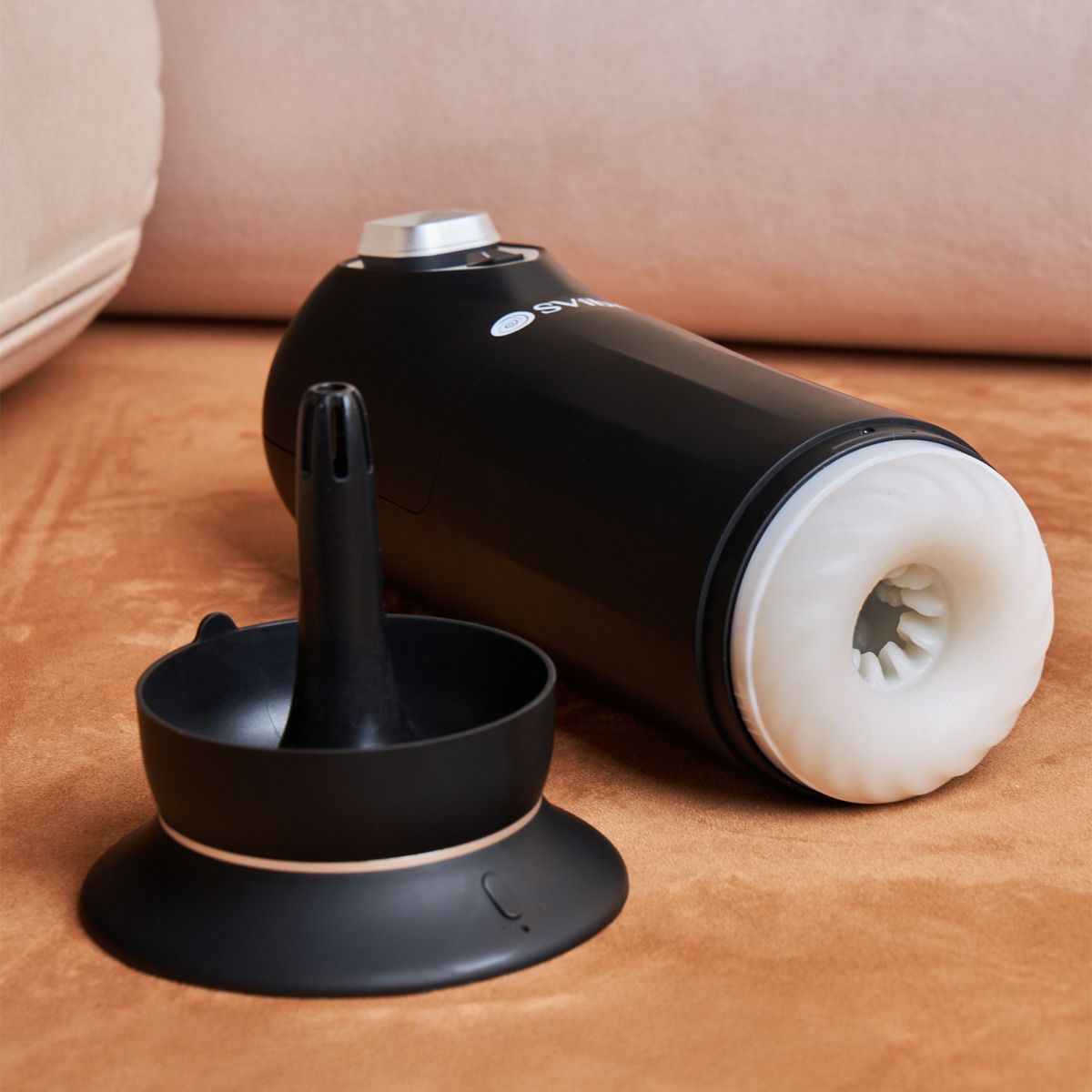 Elegantný masturbátor v temne čiernej farbe so striebornými akcentami má pevné telo z odolného ABS plastu s príjemnou povrchovou úpravou, vďaka čomu pôsobí moderne, čisto a prémiovo. Vnútorný rukáv bielej farby z hodvábne jemného TPE materiálu verne napodobňuje realistický dotyk ľudskej kože. Detailne spracovaný stimulačný tunel plný dráždivých hrotov vytvára bohatú textúru, ktorá reaguje na každý pohyb a zvyšuje citlivosť. Na vrchnej časti nájdete ovládací panel s piatimi tlačidlami. Celok doplňuje praktický vysúšací stojan, ktorý podčiarkuje premyslený design a uľahčuje starostlivosť po použití.