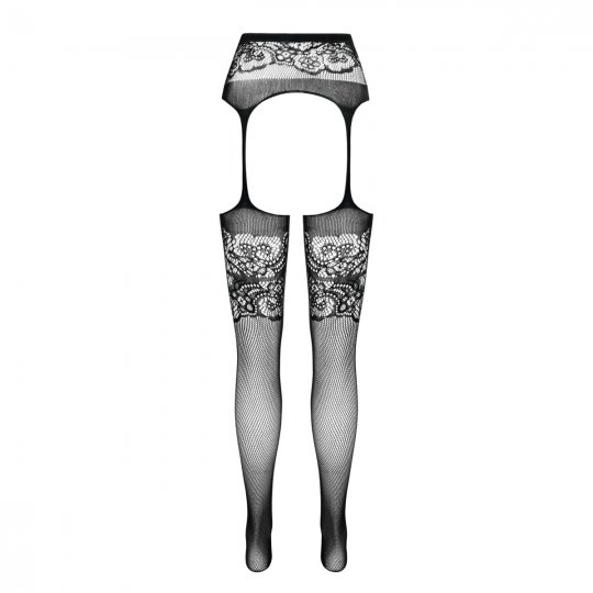 Pančuchy sú vyrobené z vysoko odolnej sieoviny, ktorá je vežmi pruná, vďaka čomu sa perfektne prispôsobí potrebám vaej postavy. Materiál obopne boky, zvýrazni ich a vďaka prunosti sa nebude zarezáva. Pančuchy sú k vrchnej časti pripevnené imitáciou podväzkov, take budú pekne dra na mieste a nebudú sklzáva dole. Otvorený rozkrok pritiahne pohžad na vá zadoček a lono. Elegantný kvetinový vzor na vrchnej časti doplňuje iroký vzorovaný lem na pančuchách, ktorý siaha takmer a ku kolenám.