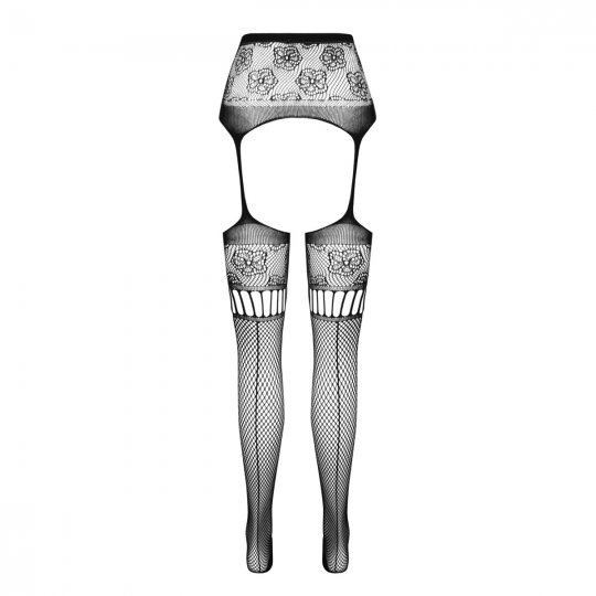 Pančuchy sú vyrobené z vysoko odolnej sieoviny, ktorá je vežmi pruná, vďaka čomu sa dokonale prispôsobí vaim potrebám a krivkám. Obopne boky, zvýrazni ich a vďaka prunosti sa nebude zarezáva. Pančuchy sú k vrchnej časti pripevnené imitáciou podväzkov, take budú pekne dra na mieste a nebudú sklzáva dole. Otvorený rozkrok pritiahne pohžad na vá zadoček a lono. Rafinované prestrihy na stehnách odhalia kou a vytvoria jedinečný strih. Jemný kvetinový vzor na leme pančúch a podväzkovom páse vyčaruje elegantný ozvlátňujúci detail.