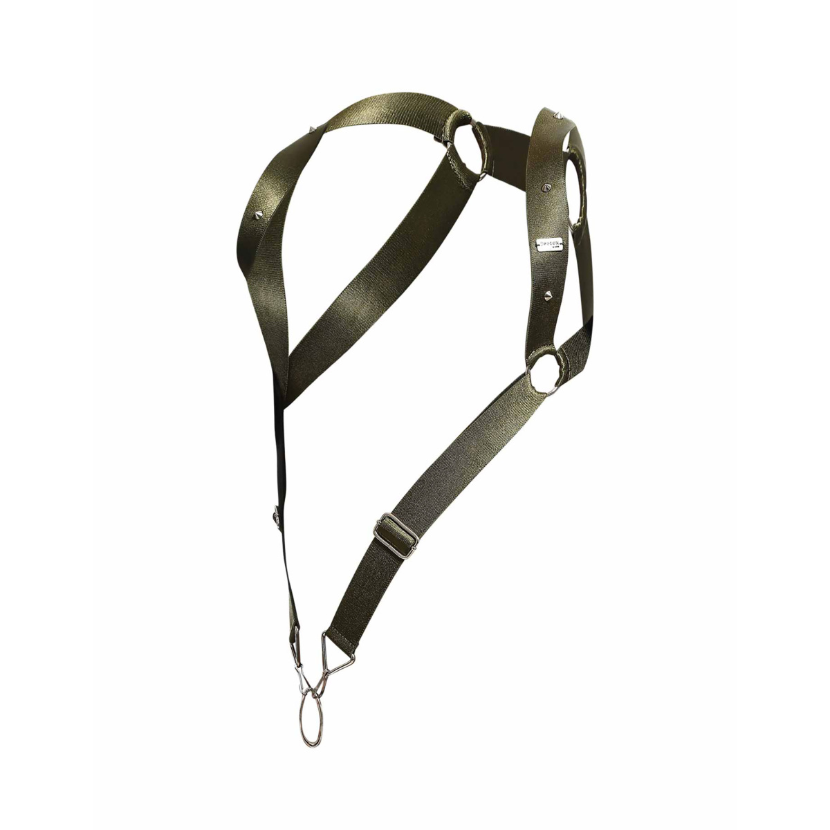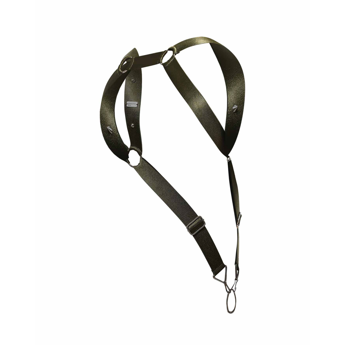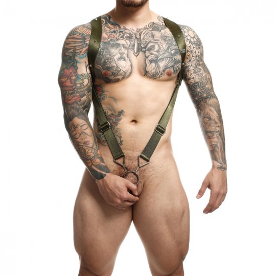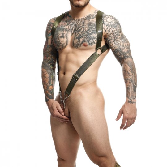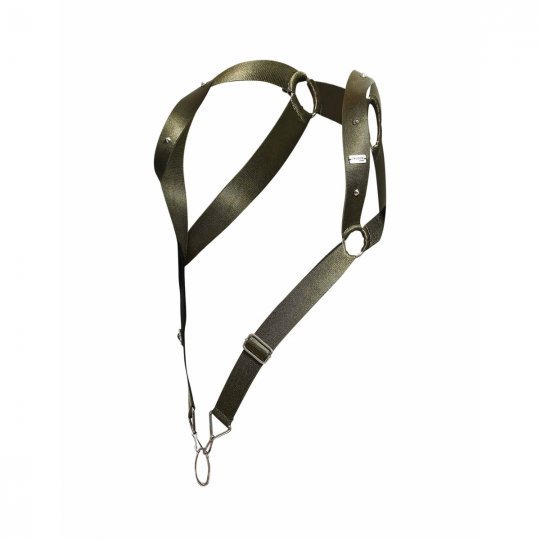 Pevné a odolné popruhy vojenskej zelenej farby sú ušité z vysoko kvalitnej tkaniny. Tá vyniká vďaka vysokému podielu viskózy z umelého hodvábu mimoriadnou pružnosťou, takže sa perfektne prispôsobí vášmu telu. Pruhy sú široké, takže sa nezarezávajú a ponúknu vám tak mimoriadne pohodlné nosenie. Sú ozdobené robustnými kovovými akcentami, ako sú krúžky, jazdce, karabíny a štyri ostré hroty, aby podčiarkli tvrdší dizajn. Vďaka jazdcom je dĺžka popruhu v prednej časti nastaviteľná a ten je zakončený veľkým krúžkom na penis.