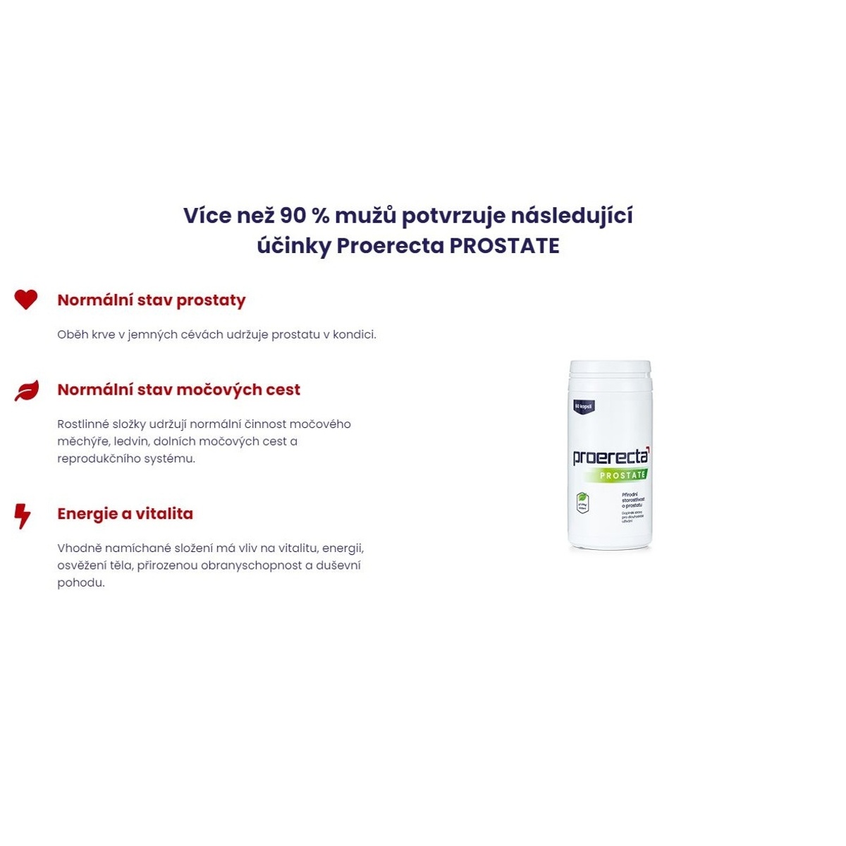 Každý muž by mal tiež myslieť na svoje zdravie. Možno aj vás začína trápiť časté, neúplné či dokonca bolestivé močenie, ktoré vás budí v noci. Za všetkým stojí prostata. S týmto doplnkom stravy Proerecta PROSTATE dostanete svoju prostatu do kondície a výrazne tým prispejete k jej normálnemu stavu. Nejedná sa o žiadny liek, ale o unikátne prírodné extrakty rastlín a bylín, ktoré chránia a napomáhajú k správnej funkcii nielen prostaty, ale aj močových ciest, obličiek, reprodukčnej sústavy a celkovému krvnému obehu. Prvotriedne ingrediencie sú ako koktail namiešané presne pre potreby mužov.