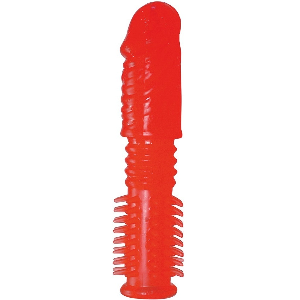 2. návlek na vibrátor, penis alebo prst s dráždivými výčnelkami (dĺžka 14 cm, priemer vnútri 1,5 cm - prispôsobivý)