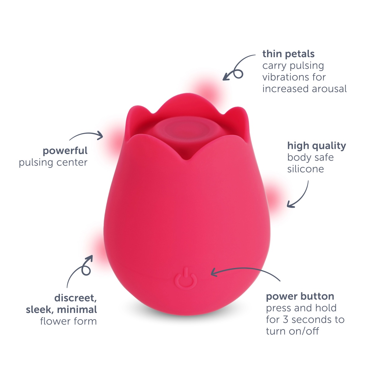 Elegantný stimulátor v štýlovom designe púčiku ruže v červenej farbe ozdobí nielen váš nočný stolík. Je vyrobený z hodvábne jemného silikónu prémiovej kvality, ktorý neobsahuje ftaláty, BPA ani latex, takže je nezávadný pre ľudskú pokožku. Jeho úžasne hladký povrch pôsobí na dotyk celkom prirodzene. Guľaté telo púčika sa pohodlne drží v ruke a ukrýva vo svojom strede malý náustok pokrytý tenkou membránou. Decentne tvarované okvetné lístky sú mäkké a flexibilné, takže rozmaznajú vaše zmysly zvodným pohladením. Vďaka svojmu drobnému rozmeru je tento stimulátor ideálnym spoločníkom na cesty. Ovládanie zaisťuje jediné intuitívne tlačidlo na bočnej strane tela.