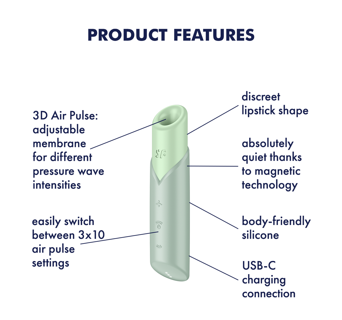 Neuveriteľne elegantný design stimulátora v modernej zelenej farbe vás uchváti na prvý pohľad. Je vyrobený z jemného lekárskeho silikónu, ktorý pohladí vaše partie s úplnou nežnosťou a je celkom nezávadný pre ľudskú pokožku. Krátka tyčinka veľkosti väčšieho rúžu disponuje mäkkou skosenou špičkou, ktorá perfektne vyhľadá svoj cieľ a zameria svoju pozornosť iba na najcitlivejšiu erotogénnu zónu ženy. Skvelo sa drží v ruke a dopraje pohodlnú a presnú manipuláciu. Na tele potom nájdete 3 ľahko dostupné tlačidlá a na konci 3 skryté LED diódy, ktoré vám ukazujú silu vášho pôžitku.