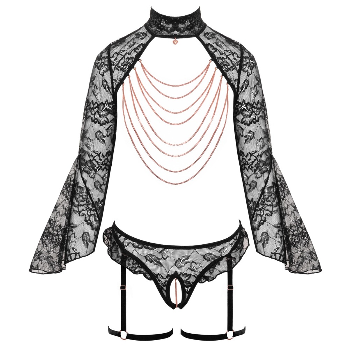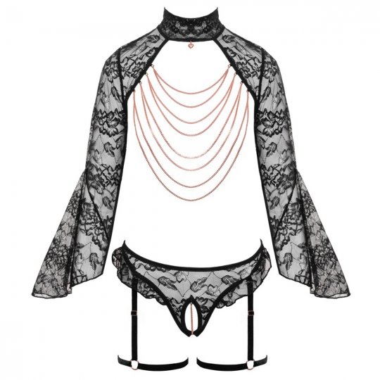 Súprava v tajomne čiernom sofistikovanom designe je uitá z hodvábne jemnej čipky so zamatovými kvetinovými motívmi, ktoré dodávajú látke hĺbku a zmyselný kontrast. Krátke bolerko s golierom sa zapína na zátylku na rad háčikov a jeho dlhé volánkové rukávy pôsobia nene aj dramaticky zároveň. Ozdobné retiazky vo farbe ruového zlata z odolného kovu bez obsahu niklu v oblasti dekoltu sú odoberatežné, take je moné vzhžad žahko prispôsobi vaej nálade. Spodnú čas doplňujú atraktívne tangá s otvoreným rozkrokom, ktoré prirodzene zvýraznia zadoček a sú doplnené volánkovými lemami okolo bokov, integrovanými push-up podväzkami okolo stehien a kratou kovovou retiazkou pre jemnú stimuláciu pri kadom pohybe.