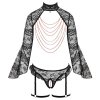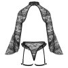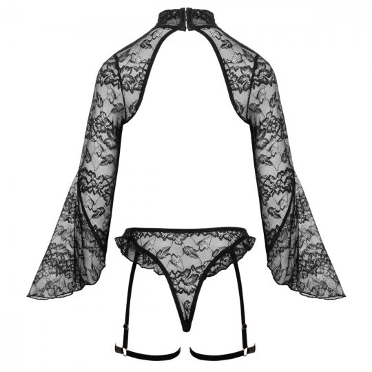 Objavte v sebe romantickú nenos a odvánu príalivos, ktorá rozprúdií fantáziu aj túbu. Táto facinujúca dvojdielna čipkovaná súprava premení kadý okamih v dokonalý záitok plný modernej elegancie a pikantného zvádzania. Krátke bolerko s golierom a dlhými volánkovými rukávmi pôsobí ako jemné pohladenie a zároveň zvýrazni enské krivky. Excelentná ozdoba dekoltu v podobe prevesených retiazok vytvára dojem luxusu a jedinečné tangá s podväzkami vám dodajú nádych prirodzeného sex-appealu. S touto súpravou sa stanete zosobnením zvodnosti, elegancie aj neodolatežného sebavedomia.