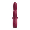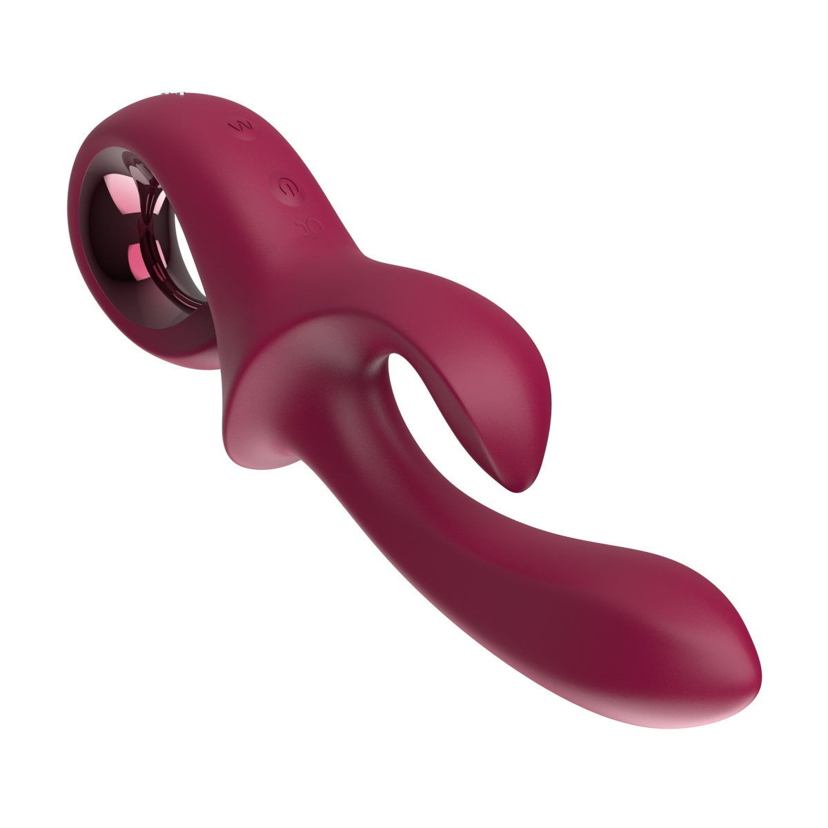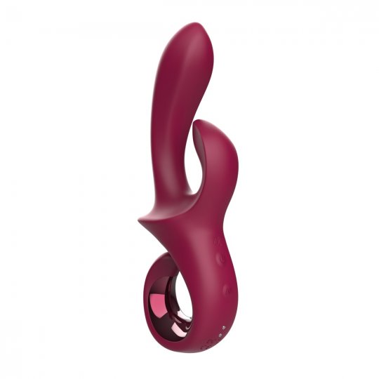 Tento štýlový vibrátor v elegantnom a celkom originálnom designe vínovo červenej farby je vyrobený z hodvábne jemného silikónu prvotriednej kvality, ktorý je šetrný k pokožke a pohladí vaše citlivé partie s neuveriteľnou nežnosťou. Rukoväť v tvare očka zdobí lesklý odolný ABS plast a dobre sa drží v ruke. Má ľahko zosílené rameno s ergonomicky zahnutou úzkou špičkou pre príjemnú penetráciu a perfektne vyhľadá a zasiahne svoj cieľ. Decentné hrany na tele si užijete každým pohybom. Špicatý flexibilný stimulátor klitorisu potom rozvinie nielen pikantnú fantáziu, ale vďaka väčšiemu zakriveniu sa postará o intenzívne pocity aj pri letmom dotyku. Na rukoväti nájdete dve ľahko dostupné tlačidlá.