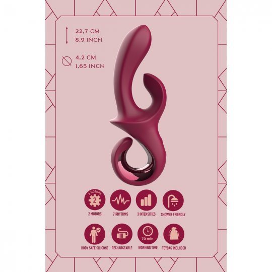 Vibrátor ukrýva dva výkonné motory, ktoré pracujú samostatne a prekvapí vás nežným pohladením aj búrlivou silou. Na výber budete mať hlbokých 10 vibračných a pulzačných rytmov pre každý z nich. To znamená, že si môžete individuálne zvoliť intenzitu aj rytmus, aký vám bude najviac vyhovovať. Čaká na vás nielen zvodná masáž bodu G, čo je jedna z najcitlivejších erotogénnych zón, ale tiež cielená bodová stimulácia klitorisu, ktorú ucítite až v končekoch prstov. Nechajte sa uniesť súhrou duálnych motorov a vychutnajte si naplno mimoriadne vyvrcholenie.