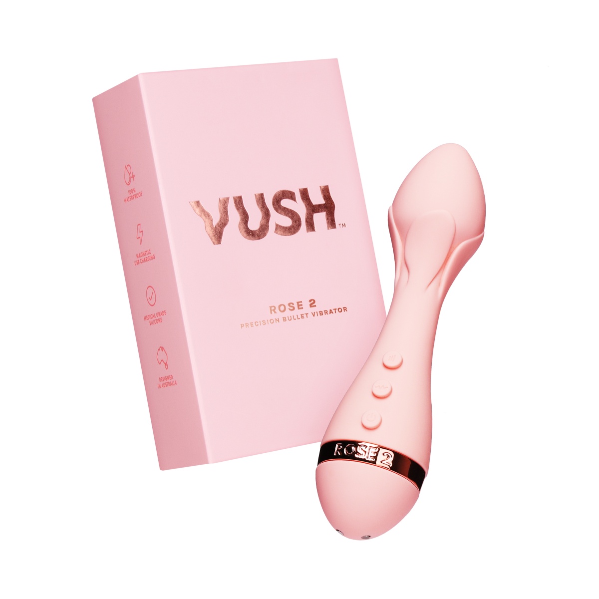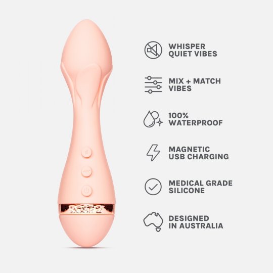 Elegantný vibrátor v rozkošnej ružovej farbe je vyrobený z hodvábne jemného silikónu prvotriednej lékarskej kvality, ktorý je nezávadný pre ľudskú pokožku a pohladí vaše partie s neuveriteľnou nežnosťou. Má originálny design púčiku ruže, ktorý lemuje flexibilnú guľatú úzku špičku. V strede má výrazné zúženie tela. Široká rukoväť ozdobená prstencom vo farbe ružového zlata z odolného ABS plastu sa dobre drží v ruke a na nej nájdete tri dostupné ovládacie tlačidlá.